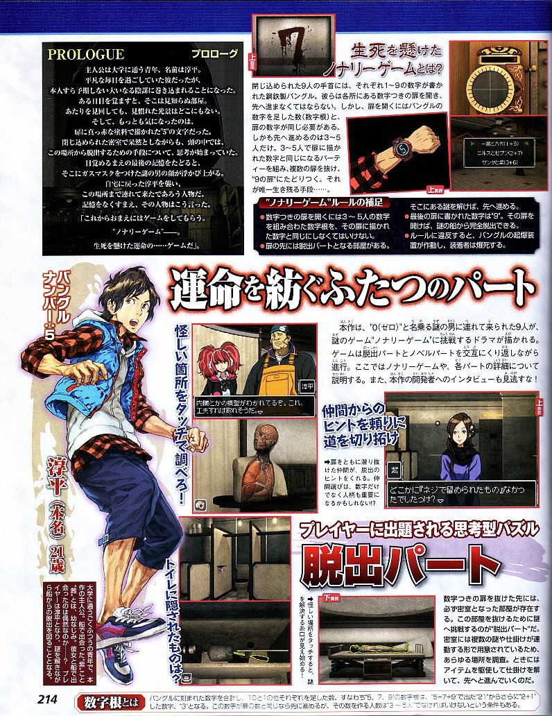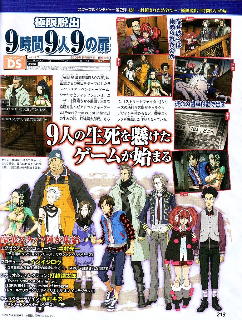 Kinu Nishimura, habitué à bosser pour Capcom (Canon Spike) ou sur des dessins-animés comme Overman King Gainer, signe le design d’un jeu DS où on lit beaucoup, on réfléchit trop, et on touche un peu : “Extreme escape 9 hours 9 people 9 doors”. C’est un peu la mode sur cette console (Phoenix Wright, Hotel Dusk, Pr Layton, etc).