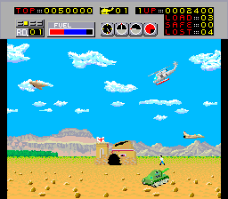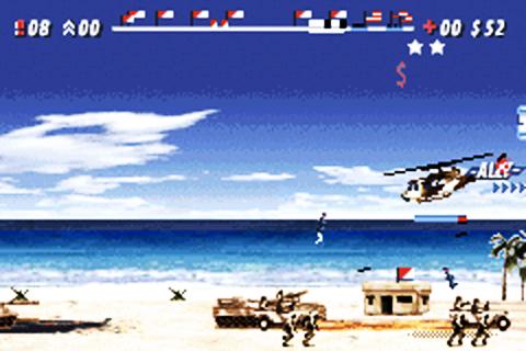 Comme de bien entendu, le jeu se déroule toujours en scrolling horizontal[2], avec dans le coin gauche les meuchants, dans le coin droit les américains (par déduction les gentils, même si on pourrait objecter très justement sur ce dangereux manichéisme politique).Mais fi des otages à récupérer, maintenant il faut couvrir la progression de notre armées au sol. Pour se faire, fini les petites bombes pourrites de l’original : en avant les roquettes. Douce arme, limitée au nombre de 8 unités par voyage.