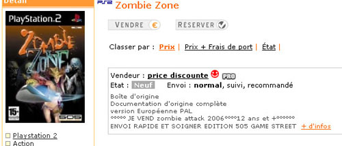 En essayant de me le procurer, je me suis fait entuber sur le site 2xmoinscher.com par un gars vendant en douce "Zombie Attack" (une sombre merde sans le moindre rapport); jouant sur le fait que ce soit (vaguement) précisé dans le descriptif.