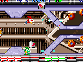 "Keu cé meugnooon" aurions-nous pu entendre, si les SMS eurent existés, à l'époque des Gradius et autres Raiden. On sortait enfin des vaisseaux anguleux agressifs avec leurs power-up abstraits. En effet, dans l'univers de nos léporidés spatiaux les bonus sont contenus dans des conserves de carottes; qui s'ouvrent d'un leste coup de poing ganté de jaune. On y trouve un joli noeud pour augmenter la puissance de tir, un nounours qui rend invulnérable, ou encore des missiles par pack de dix.
