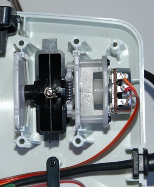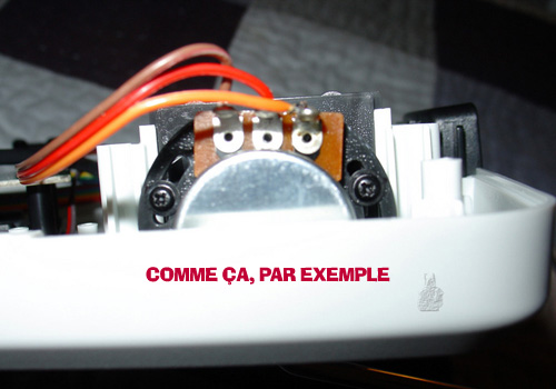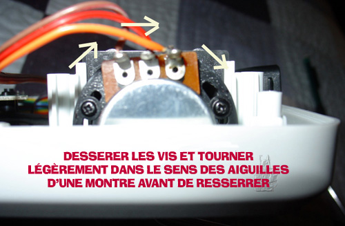 Le principe est de décaler un petit peu le potentiomètre sur l’axe du vibrato, en dévissant gentiment les deux petites vis comme suit :