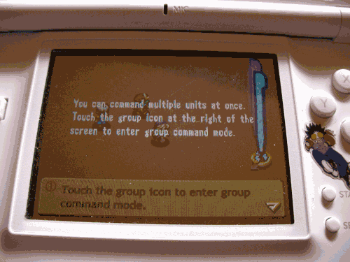 ...de récolte de minerai. On connait le refrain. Par-dessus ça, des schémas illustrés vous apprennent à tenir un stylet. Avec la main donc. Bien content de l'apprendre. On commence à bien avoir compris, on aimerait bien jouer maintenant. C'est là que le jeu nous sous-titre les précédents schémas POUR BIEN QU'ON AIT BIEN COMPRIS les trois premiers mécanismes de jeu.