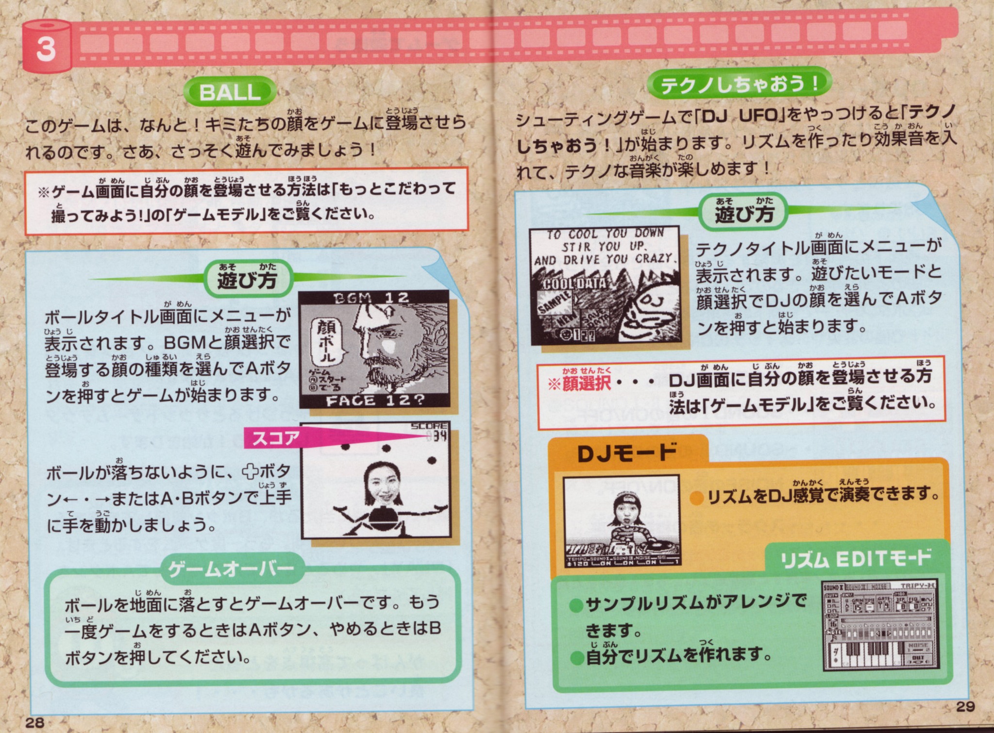 Une fois l’une de ces options sélectionnée, choisissez un visage pour le DJ. FACE 1 et 2 sont des visages stockés dans la Caméra Game Boy. le “?” indique la photo prise par vous.