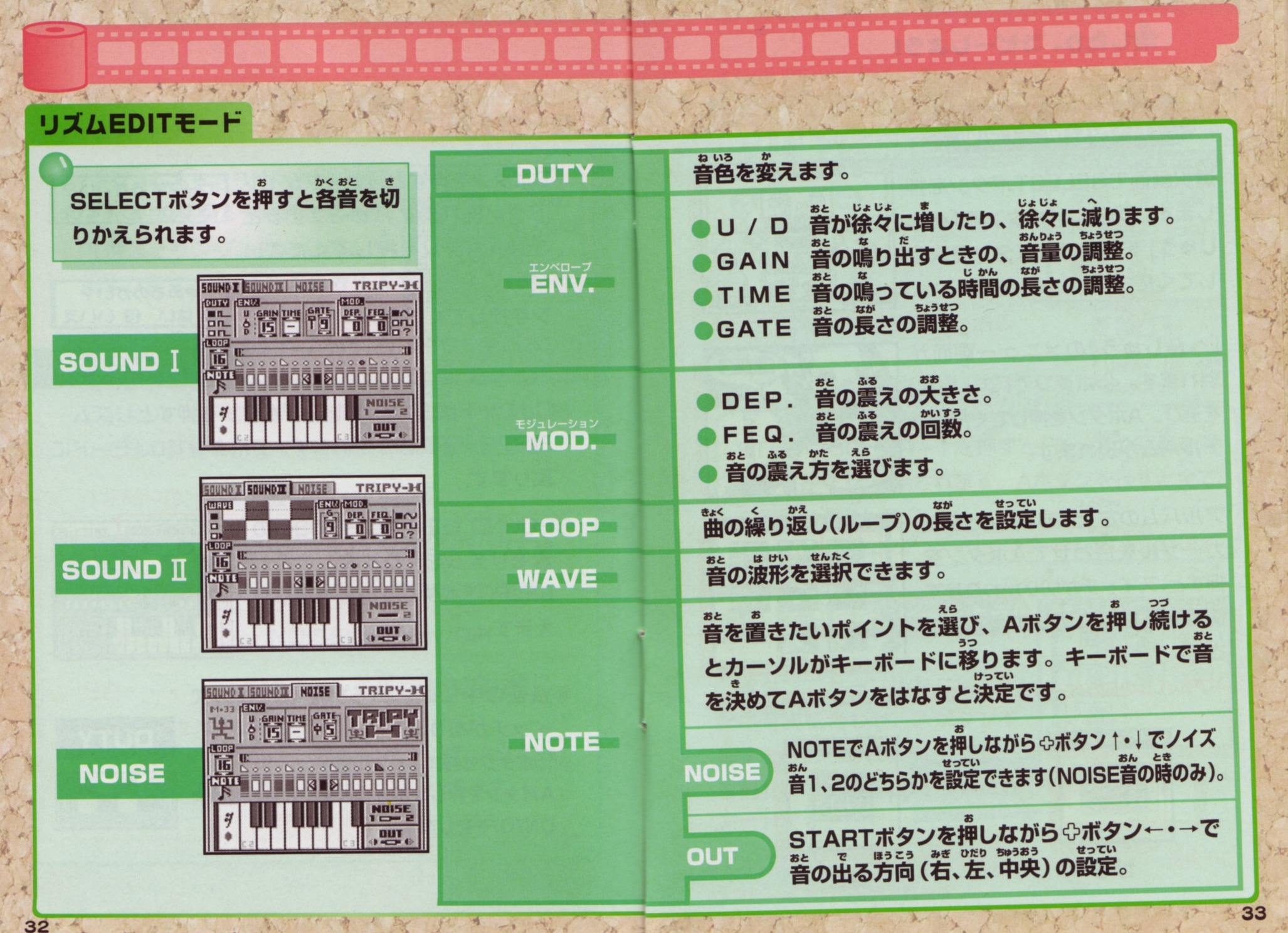 Placez le curseur sur NOTE. Actionnez la manette multidirectionnelle vers la gauche ou vers la droite afin de sélectionner le moment de la chanson, où vous voulez ajouter une note. Maintenez ensuite le Bouton A enfoncé. Actionnez la manette multidirectionnelle vers la gauche ou vers la droite afin de sélectionner une note. Relâchez le Bouton A pour intégrer la note à l’endroit voulu de la chanson. Si vous voulez effacer une note dans une chanson, sélectionnez le premier bouton du clavier (rest).