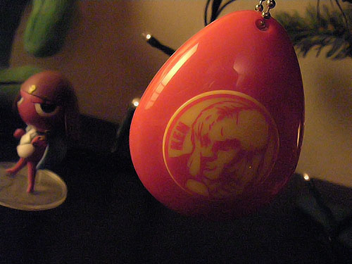 Il n'est pas dans les tons rouges ou vert, mais Stafy ? En peluche par exemple (voire l'étoile de Mario).