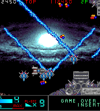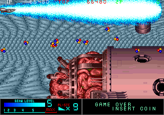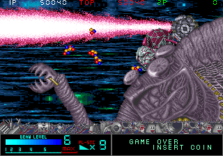 Enfin il y a celui-là, le boss le plus laid de l’histoire, un truc arachnéen qui va et vient en déplaçant une grosse boule tirant des lasers, le long d’un monstre (l’article wiki us parle d’opabinia…) qui prend la moitié de l’écran et ne fait rien, sinon agiter un truc avec des dents pour charger le super tir du boss. C’est à vivre.