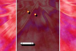 Dans Arkanoid, le jeu prend en compte l’écartement des deux écrans par la charnière de la console : derrière ce gros centimètre de plastique, le jeu continue, les boules suivent leur trajectoire, invisibles. D’un côté, il faut bien avouer, c’est plus naturel, et ça évite que le jeu aille trop vite, un des problèmes de Nervous Brick’down : Arkanoid prend en compte le temps de baisser ou de remonter les yeux sur l’autre écran.