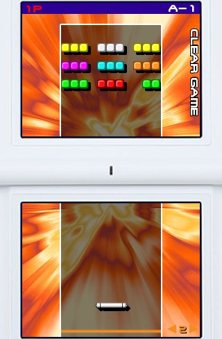 Premièrement, l’essentiel est là : toujours le même jingle avant le début de chaque stage (composé par Ogr, mentor de l’autre génie de Zuntata), des options qui tombent des briques fracassées, l’existence d’une histoire (que j’ai pas comprise, mais tant qu’elle assume un vaisseau spatial qui renvoie une balle contre des briques… Brick’em All, concurrent DS dont il faudrait que je parle, n’en a pas, et ça manque).