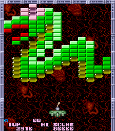 Pour essayer de réduire le temps que prend la balle à descendre les deux écrans, la largeur du terrain varie selon les niveaux. C’était plutôt une bonne idée, le jeu s’en trouve accéléré. Cependant, outre que mutiler en largeur ce qu’on gagne en longueur annule le concept même de double écran, les espaces de jeu sont parfois tellement étroits qu’ils suppriment tout intérêt au jeu : une option “Expand”, et votre Vaus en bouche près de 80%. Et comme la bille a un rebond que je continue de trouver bizarre (toucher le dessous du vaisseau la renvoie comme si elle avait frappé le dessus), placez le vaisseau au milieu et allez boire un café : à moins des (rares) trajectoires rectilignes, aucun risque de perdre.