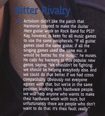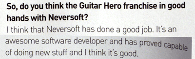 Traduction : Avec leur expérience sur Tony Hawk, Neversoft à transformé notre simulation d'Air Guitar en simulation de galérien de la guitare; enlevant le fun au profit d'un prétendu réalisme des partitions. Il faut avoir travaillé longuement sur Amplitude et Frequency pour savoir que le rôle de la partition est de changer la musique en stage de jeu vidéo, et non de mimer laborieusement les accords originaux.