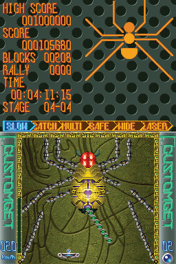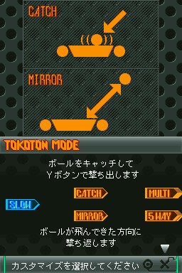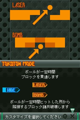 BA change complètement de modèle pour les options : à la manière de Gradius, on choisit et la chaîne de pouvoirs spéciaux (5 à déterminer parmi un panel de 10), et le moment de les enclencher (une jauge se remplit à mesure des rebonds et des briques détruites).