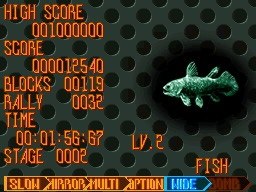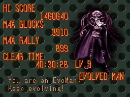 Pour revenir à Brick’em All, les modes de jeu sont assez variés ; les trois modes de jeu sont disponibles en solitaire: le mode quête multiplie les boss (deux joueurs peuvent s’entraider), quand le mode tokoton vous promet, à côté de 50 niveaux fixes, trois millions de niveaux créés aléatoirement. Votre score est récompensé d’un classement plus ou moins darwinien (de l’amibe au dauphin, en passant par l’alligator, le cygne, etc.). On me dit à ce propos que la dernière forme, Invincible, serait une sorte de Jésus Christ. Carrément.