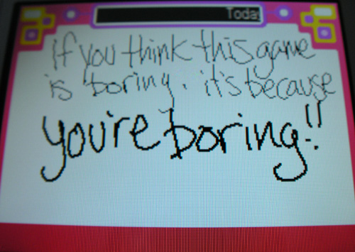 J'ai testé ce "jeu" samedi dernier, un brin intrigué, avec un pote, et après avoir galéré rien que pour comprendre comment le jeu fonctionnait, puis après avoir dessiné une bite règlementaire (règle de base du Pictochat: combien de secondes avant qu'une bite apparaisse sur la room) on a unanimement décidé que ce truc était une merde, et on a lancé Mario Kart.
