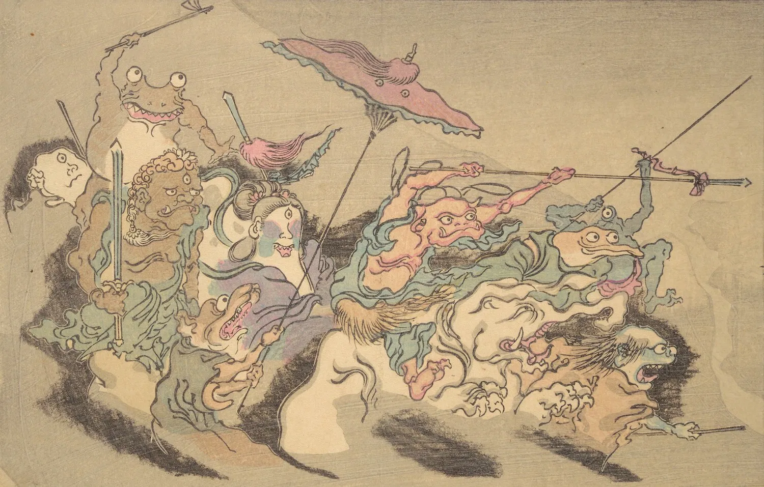 Concernant l’ornithorynque en fundoshi, je lui trouve un air de famille avec un monstre de Kyōsai Watanabe dans sa Procession des cent démons (1889) :
