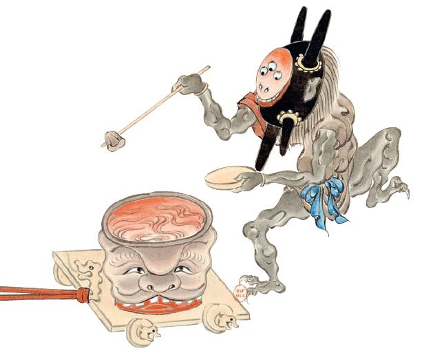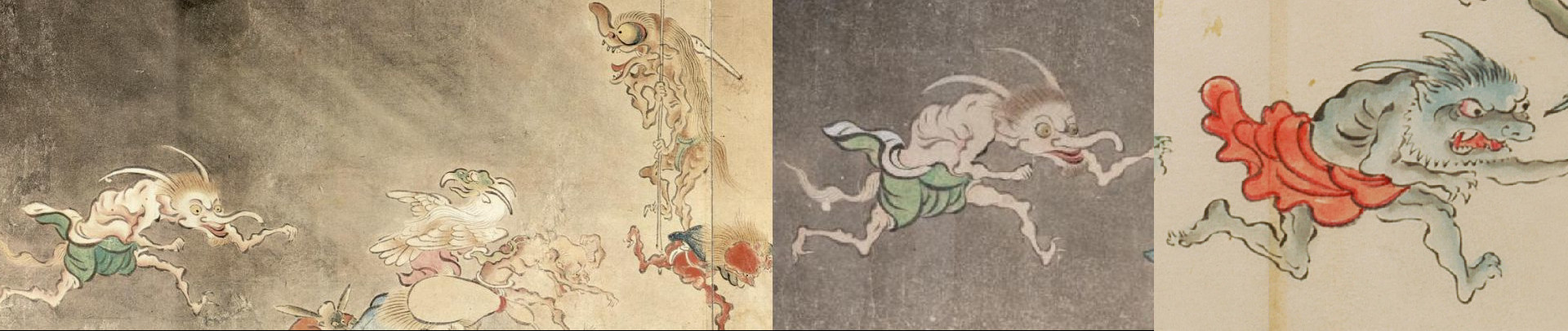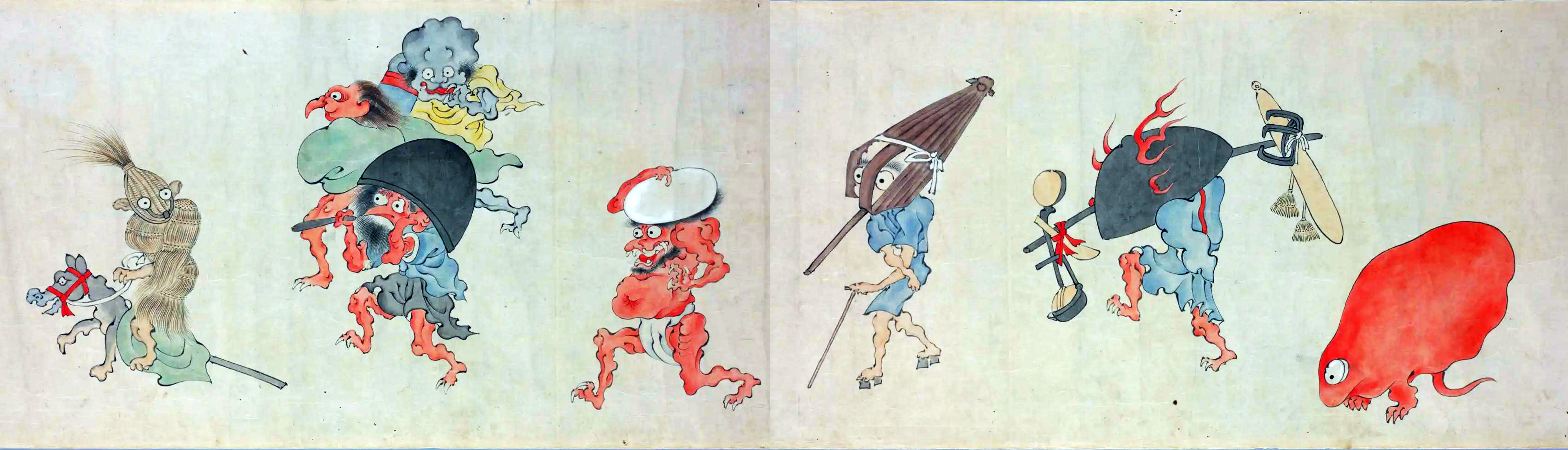 et un troisième portant un couvercle sur la tête. Avec lui on traverse la frontière parfois floue entre l’oni et un autre type de monstres, les tsukumogami, ces objets abandonnés prenant vie et réclamant vengeance***. Contrairement à beaucoup des créatures précédentes, bien plus anciennes, ce sont des inventions médiévales, reflet d’un monde qui entre progressivement dans la production industrielle.
