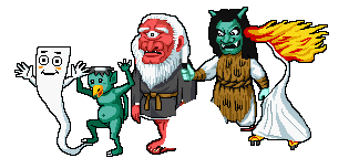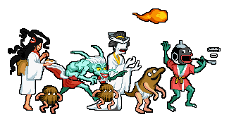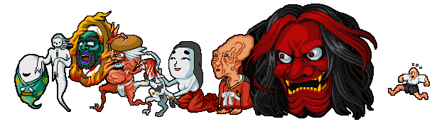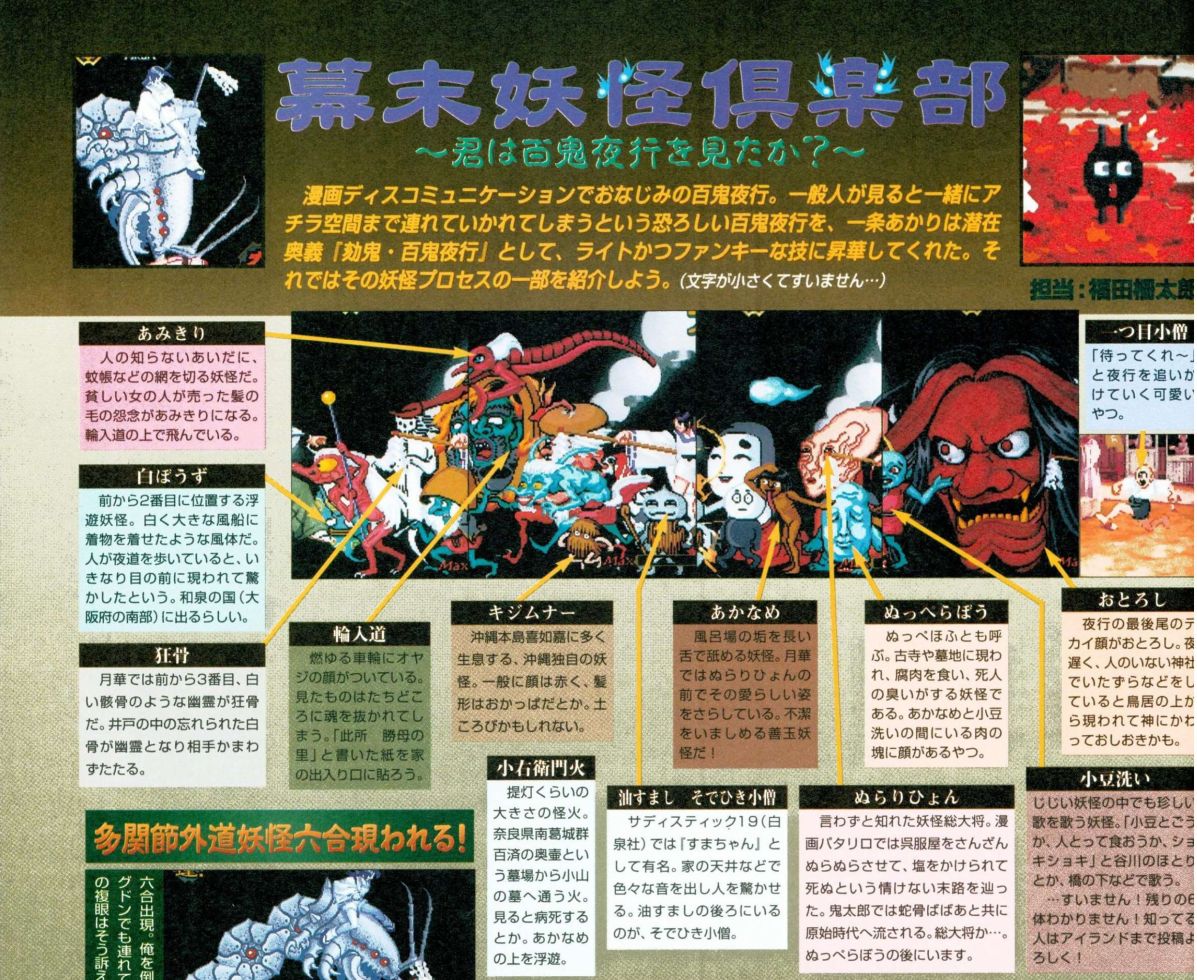 Nous voilà au bout de la trentaine de créatures. Il s’avère globalement que le·a graphiste ne s’est pas toujours foulé·e, même si on note quand même plusieurs sources, dont au moins un rouleau, voire deux, si effectivement Kyōsai l’a inspiré·e pour une créature (les autres yōkai sont dessinés dans un style très éloigné des sprites du cortège). SNK a réalisé en particulier ce que leur source principale, Shigeru Mizuki, n’avait pas fait lui-même, ce qui n’est pas rien (et mériterait d’être interrogé : pourquoi diable ne s’est-il jamais collé au sujet des parades nocturnes**** ?).