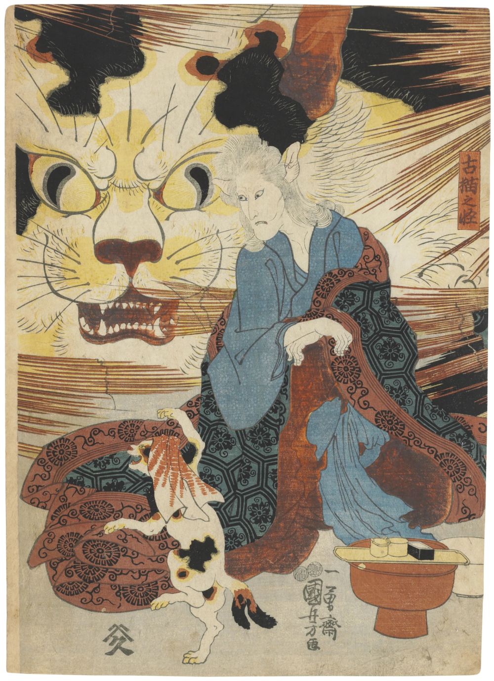 Le chat à double queue (nekomata) n’apparait pas non plus systématiquement dans les rouleaux, tout en étant un yōkai célèbre qui aura beaucoup occupé le kabuki dans le premier 19e, lors de la vogue des pièces horrifiques initiée par Tōkaidō Yotsuya Kaidan. Il provient à coup sûr d’une estampe d’Utagawa Kuniyoshi (1847) :