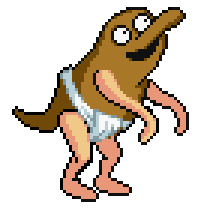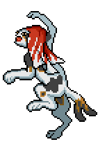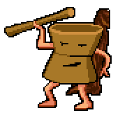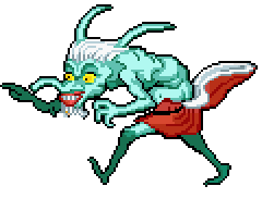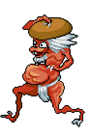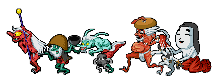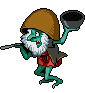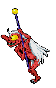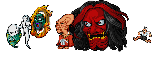 Encore un tsukumogami, celui-ci porte un bol bouddhiste sur la tête (du moins à l’origine). Bizarrement il en tient un deuxième dans la main, ustensile surnuméraire que je n’ai retrouvé dans aucune version des cortèges démoniaques, ce qui témoignerait à la fois d’une certaine volonté d’appropriation par le·a graphiste (les deux jeux créditent un·e « Pinkey ») mais également d’une certaine incompréhension de la nature du couvre-chef du monstre : il s’agissait déjà d’un bol à chanter, d’où le bâton dans la main droite.