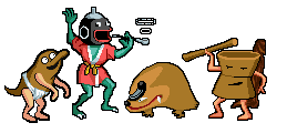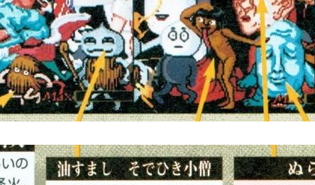 Il aura fallu boucler mes recherches pour découvrir qu’un guide (Gamest Extra n°210, 1998) avait déjà mâché en grande partie le travail (l’article en question, via le blog it’s fantastic). L’auteur, Fukuda Sakutarou, avait ainsi identifié, en partant de la gauche :