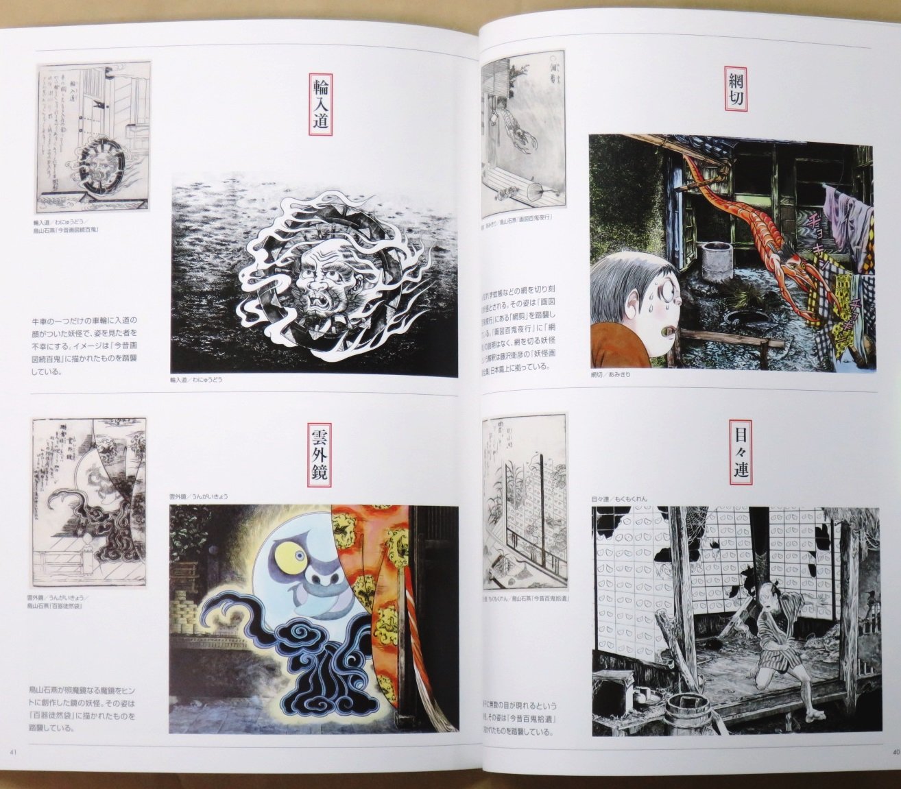 Double page d’un catalogue d’exposition**, comparant emprunts à Seiken et dessins de Mizuki.Néanmoins, des créatures comme Hitorima ou de Sodehiki Kozō (encore et toujours) permettent de s’assurer qu’un de ses bouquins traînait sur une table de SNK : ceux là sont bien nés de l’imagination visuelle de Mizuki, à partir de ses recherches ou de descriptions de folkloristes.