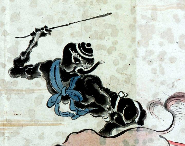 Emaki détenu par le musée des Beaux-arts d’Ōsaka, rouleau non identifié et interprétation de Kyōsai Watanabe.Même chose pour le nue, dont le graphisme évolue sensiblement selon les styles et les versions (voire qui n’est pas présent, ou pas au même endroit).