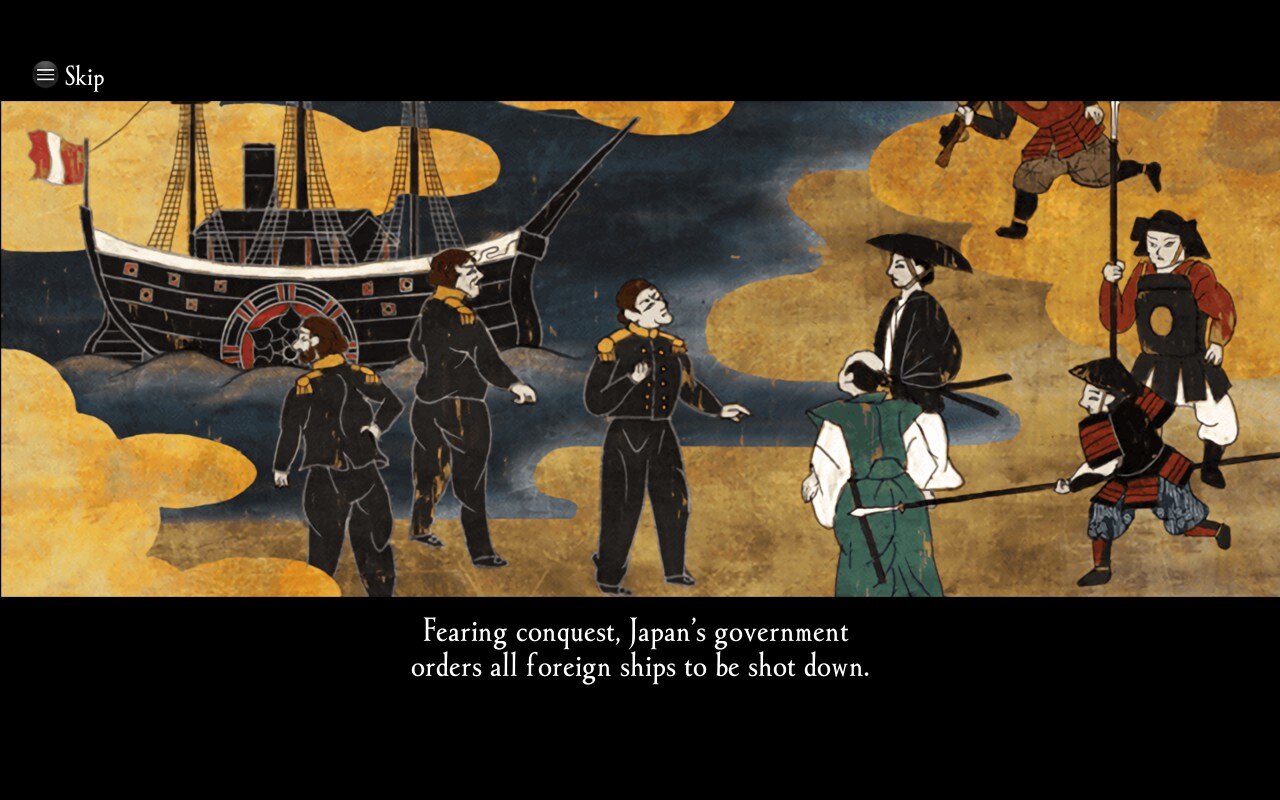 Les Japonais ne peuvent s’en empêcher, il plane encore une histoire d’étrangers qui menacent de taper l’incruste : l’introduction du jeu évoque l’édit de 1825 « pour repousser les navires étrangers » et fait allusion à l’incident Morrison en 1837.