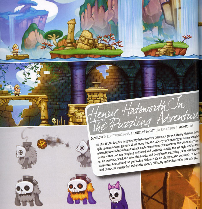 On enchaîne avec une double page des artworks de Henry Hatsworth sur DS. Un petit paragraphe indique le nom du chara-designer et détaille l’apport des choix graphiques dans le jeu.