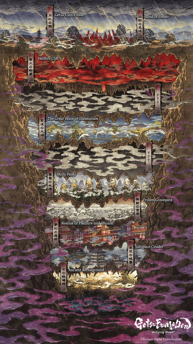 Le héros de 1987 vengeait ses deux frères assassinés par le maléfique Ryūkotsuki, lequel se déchaîne littéralement à l’amorce d’Undying Moon, un millénaire plus tard. Le nouveau personnage principal, trait pour trait son ancêtre 27 générations auparavant, s’introduit en enfer pour lui régler son compte dès la fin du premier niveau. La raison pour laquelle le jeu se poursuit ensuite n’est pas scénaristiquement très claire, mais là où l’identité visuelle du premier GetsuFumaDen était assez hétérogène, le voyage en enfer dans sa suite est si magnifique qu’on poursuit avidement la descente.