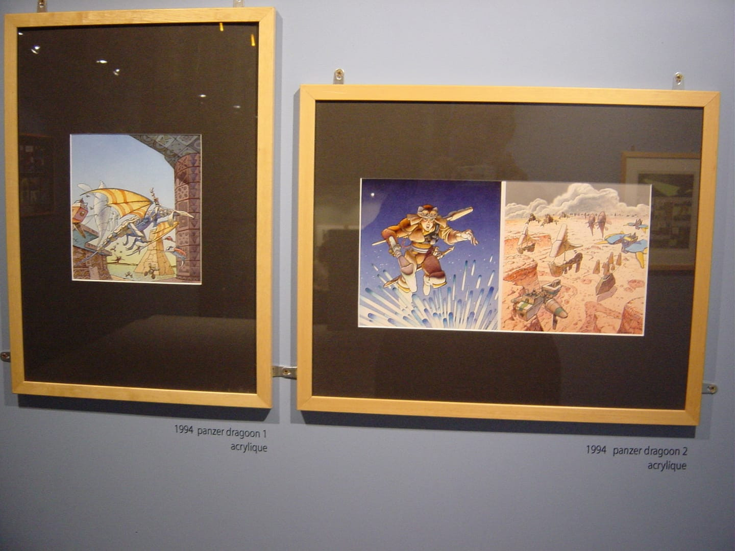 Un message court transféré par Vg Densetsu fournit deux réponses d’un coup : non seulement cette troisième illustration existait bel et bien (pas fofolle au demeurant), mais, s’il s’agit bien des originaux et pas de reproductions, les illustrations sont revenues dans les mains du dessinateur (à moins qu’elles ne les aient jamais quittées, ce qui est fort possible connaissant le souci de Moebius pour préserver ses œuvres) : elles ont été exposées au moins une première fois entre fin 1997 et début 98 dans quatre villes italiennes et une autre en 2003, à Liège (photo de OVGA ci-dessous).