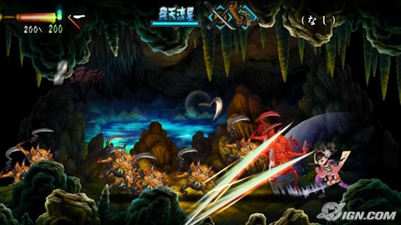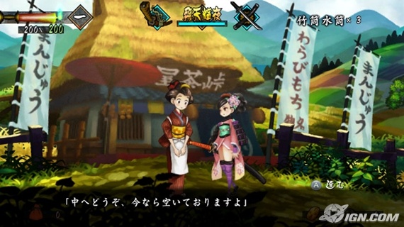 Du talus de mes deux petites heures de jeu, je ne peux pas encore dire à quel point Muramasa est génial. Sans que ce soit un quelconque problème, le gameplay se présente clairement comme une suite à Odin Sphere. Les améliorations au jeu PS2 sont cependant nombreuses. Les stages en boucle sont, par exemple, remplacés par un agencement à la Castleroïd où il faudra récupérer certaines armes et revenir sur nos pas pour atteindre les niveaux suivants. Ou encore la présence de sauvegardes plus régulières ou de Continue plus rapides. Je trouve aussi que les décors d’arrière plan, tout aussi colorés, ont plus de profondeur grâce à l’utilisation plus que généreuse de multiples plans parallèles. Le première vue sur les collines de la campagne du Japon féodal, avec les Tori plantés au milieu de champs zébrés par les lentes ombres des nuages fut un enchantement.