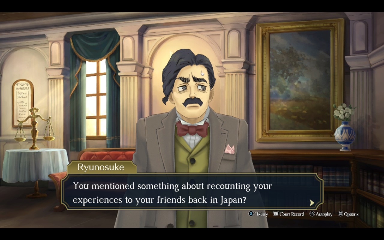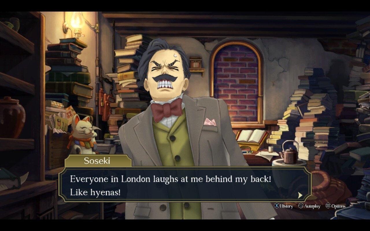 Si le Yakuza Studio parait s’être contenté de vagues souvenirs de lycée pour sa quête secondaire, on ne peut reprocher à Shū Takumi, le directeur/scénariste/un peu tout de The Great Ace Attorney Chronicles (3DS puis Steam, Switch, PS4), de ne pas s’intéresser à Sōseki et à son séjour londonien : que ce soit sa célèbre page blanche en guise de premier rapport annuel, son expérience désastreuse du vélo, sa litanie de pensions successives, et plus globalement son profond sentiment de déclassement et de mal-être, on repère avec plaisir mentions et références réelles.
