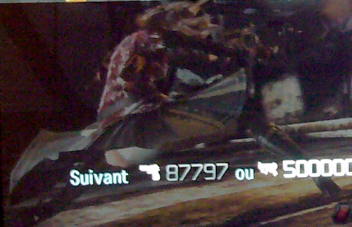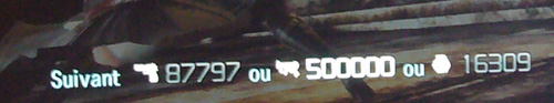 Indique le nombre de points requis pour atteindre le prochain niveau pour chaque arme. Le niveau du personnage est en fait l’addition des niveaux de ces trois armes (pistolet 29 + mitraillette 28 + grenade 21), obligeant ainsi à varier l’équipement pour passer plus rapidement les niveaux d’expérience.