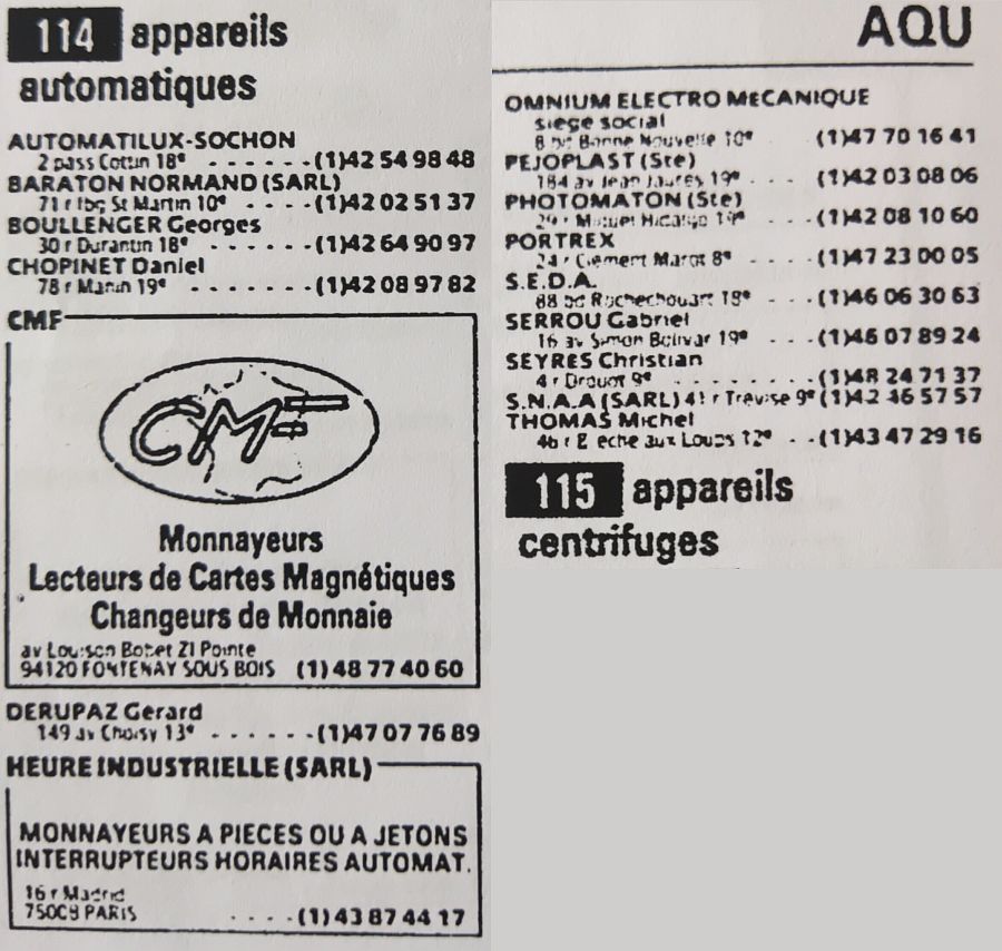 Elle existait en effet toujours à la même adresse au moment de la parution de l’annuaire des pages jaunes en 1987. Malheureusement la rubrique 114 (« appareils automatiques ») n’existait plus l’année suivante, ce qui aurait permis de s’assurer que le local n’avait pas changé de propriétaire entre le début de l’année et le tournage — et l’entreprise ne se trouvait pas dans les rubriques apparentées dont on m’a fait la copie. Je tenterai de survivre avec ce léger doute.