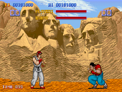 Par exemple Mike, de Street Fighter 1. En rouge et bleu devant le mémorial national du mont Rushmore, sa psychologie s’enrobe irrésistiblement d’une coloration patriotique, voire d’un désir de rêve américain et d’aspiration sociale.