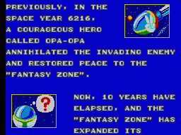 Bizarrement Fantasy Zone II (1987, Sega Mark III - notre Sega Master System en mieux - puis arcade), se déroulant dix ans plus tard, parle maintenant de 6216, années galactiques toujours (image).