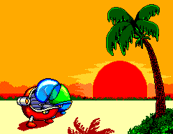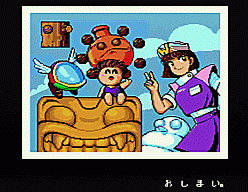Quant à Fantasy Zone Gear (Game Gear, 1991), il fait un saut d’un siècle dans le temps et d’une génération dans la famille d’Opa-Opa : en 6344, son fils devra le délivrer des sempiternels Menons. La longévité d’Opa-Opa est d’ailleurs étonnante, et marque un changement complet de conception du personnage : au départ il y avait un pilote dans le machin anthromorphe (le rapprochant encore plus des TwinBee de Konami) : par exemple les jeux proposent d’acheter des vaisseaux supplémentaires (« extra ship ») et non des vies supplémentaires ; ou encore Galactic Protector (1988) qui s’achève sur un cockpit ouvert et concède à son pilote un héliotropisme très humain (image de gauche).