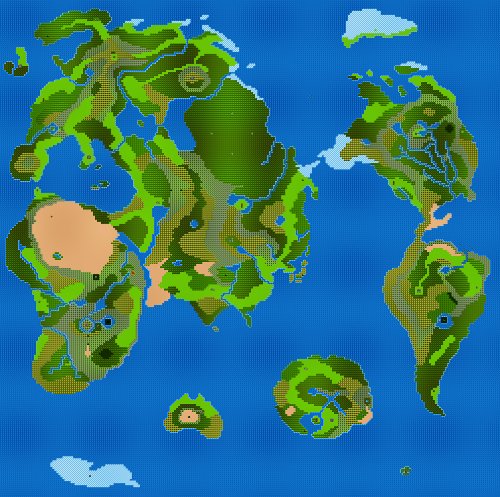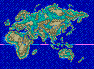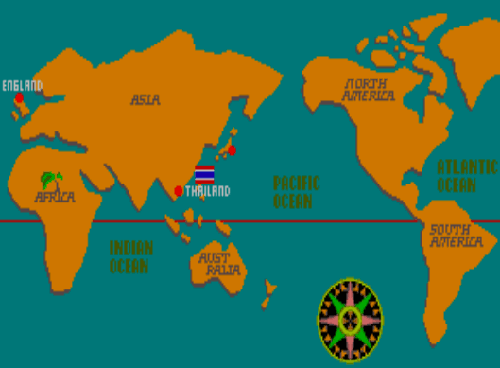 6. Retour à Mercator pour la carte la plus soigneuse du lot (pour un jeu de combat de 1994). Même les reliefs et les fleuves sont corrects. Ce que j’aime bien dans celle-là : les États-Unis ne sont pas représentées bien que le jeu propose des Américains parmi les personnages jouables. Manque de temps pour finir la carte (ou un scrolling) ? Dédain ?