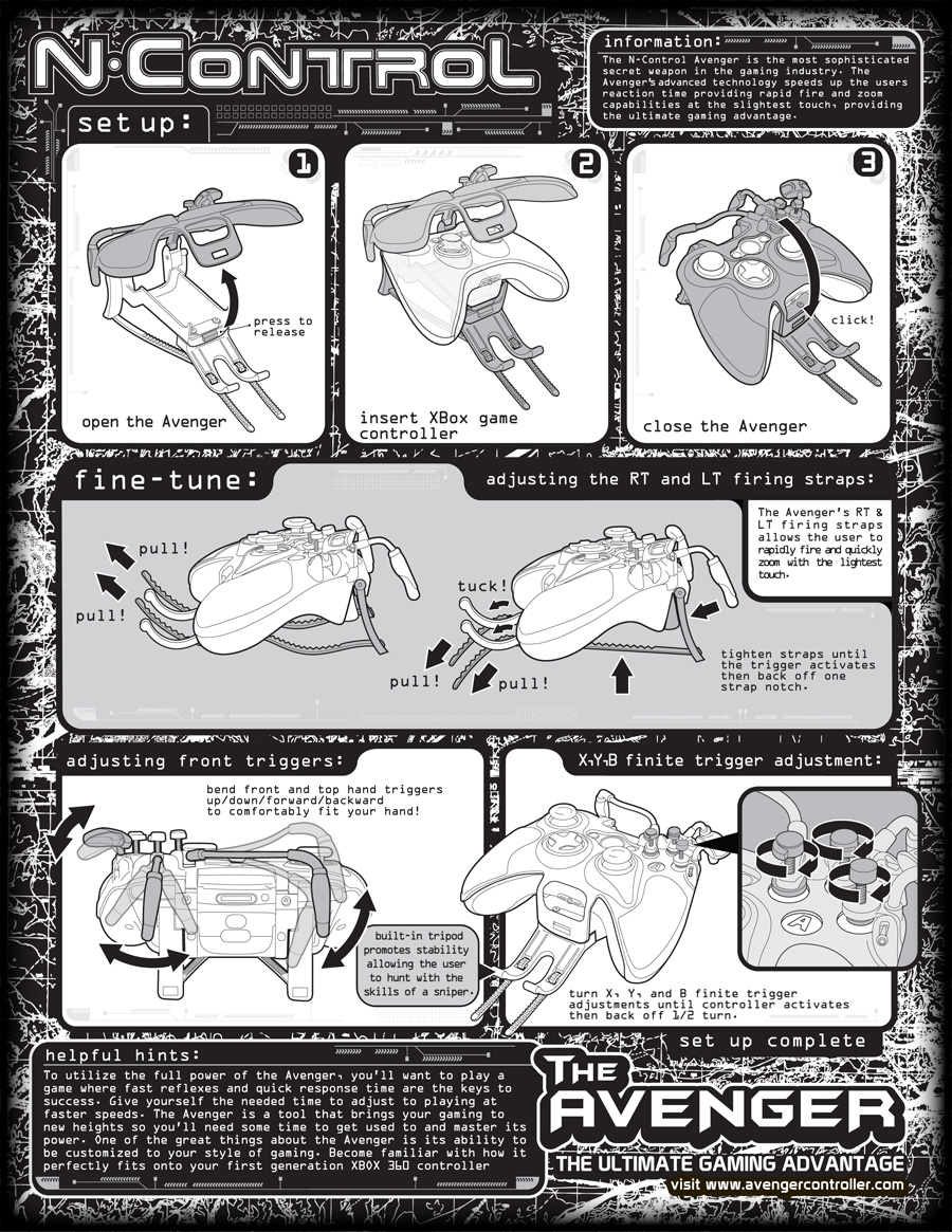 L’Avenger est une coque qui facilite et améliore la rapidité d’accès aux boutons grâce à des câbles et des perches réglables. Principalement destiné aux FPS, l’équipement permet d’actionner nombre de touches sans lâcher les deux sticks analogiques.
